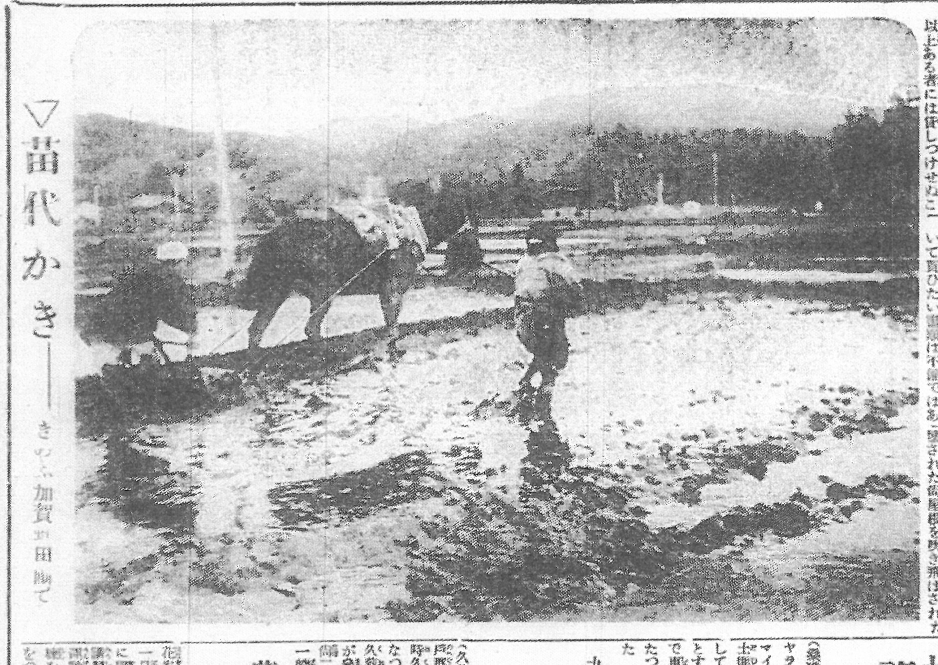 写真には「苗代かき」に励む農家の姿が写し出されています。泥に足を取られながらも馬と共に土をならすその光景からは、どんなに中央の政経が混乱しようとも、春が来れば田を耕し種をまくという、地に足のついた人々のたくましい営みが伝わってきます。