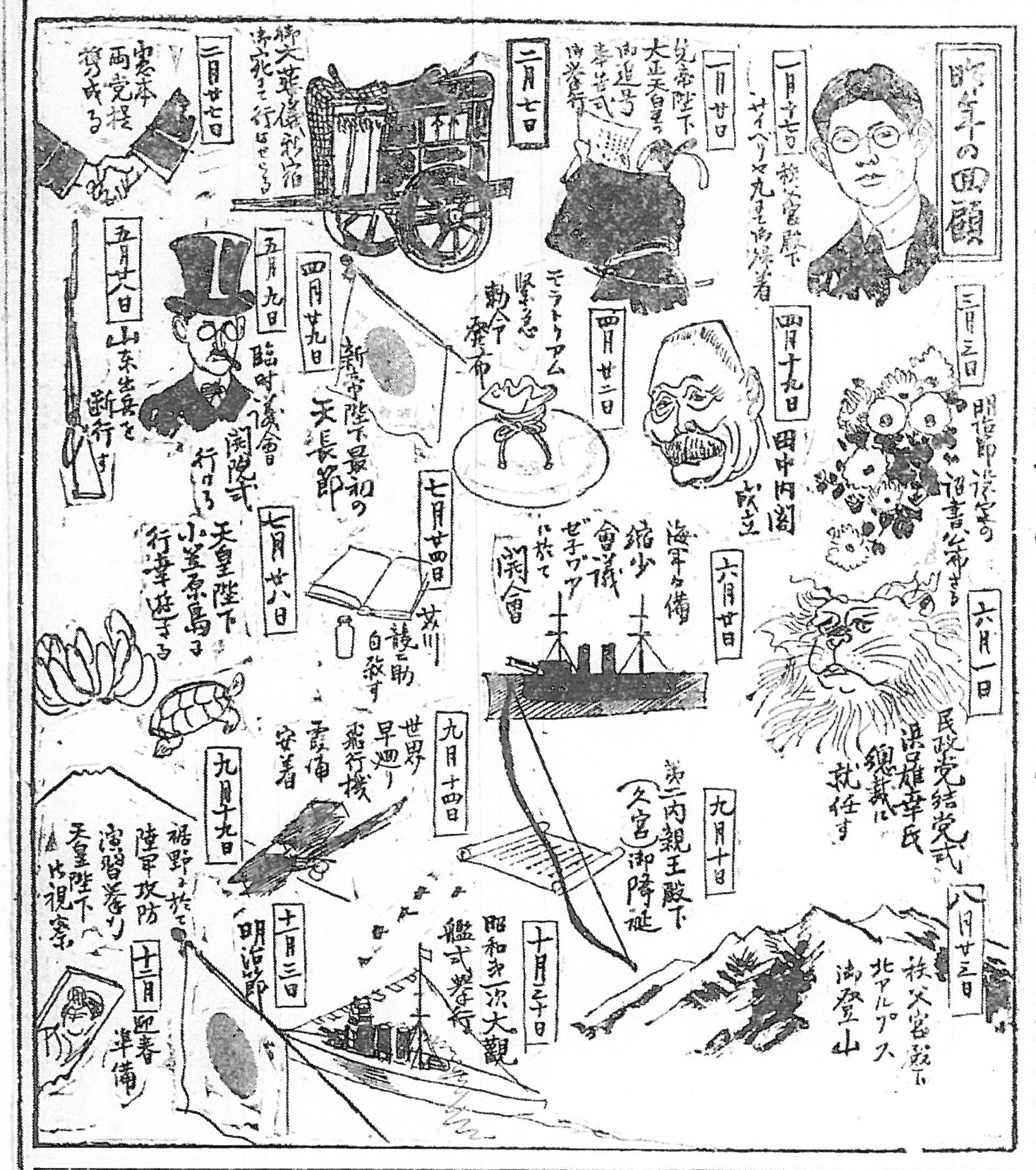 この回顧図は、経済的な危機と新しい時代の希望、そして忍び寄る軍靴の足音が奇妙に同居していた昭和2年という時間を、当時の読者の視線で追体験させてくれます。100年近い時を経た今、この色褪せた新聞の切り抜きを眺めると、先行き不透明な時代を懸命に生きた人々の息遣いが聞こえてくるようです。