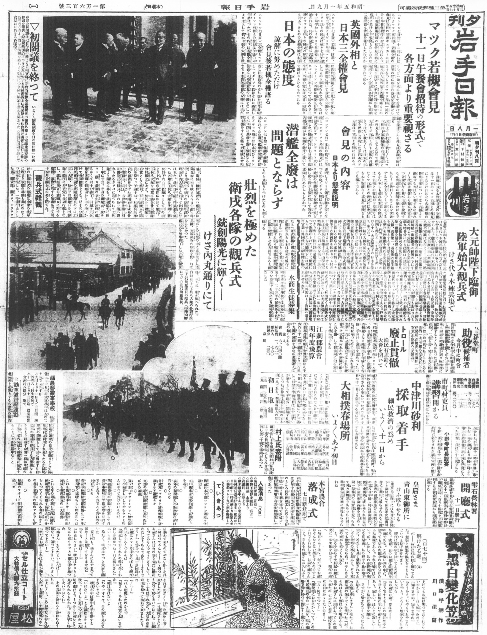 • 緊迫の軍縮交渉: 「マック(英首相)若槻全権会見」の見出しは、当時のロンドン海軍軍縮会議に向けた緊迫した外交の舞台裏を伝えています。