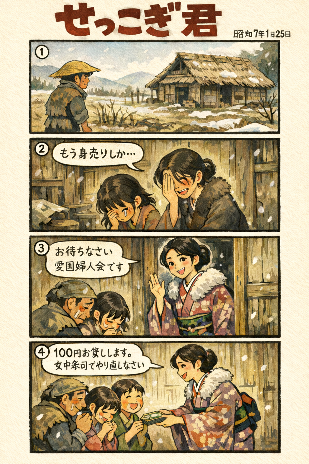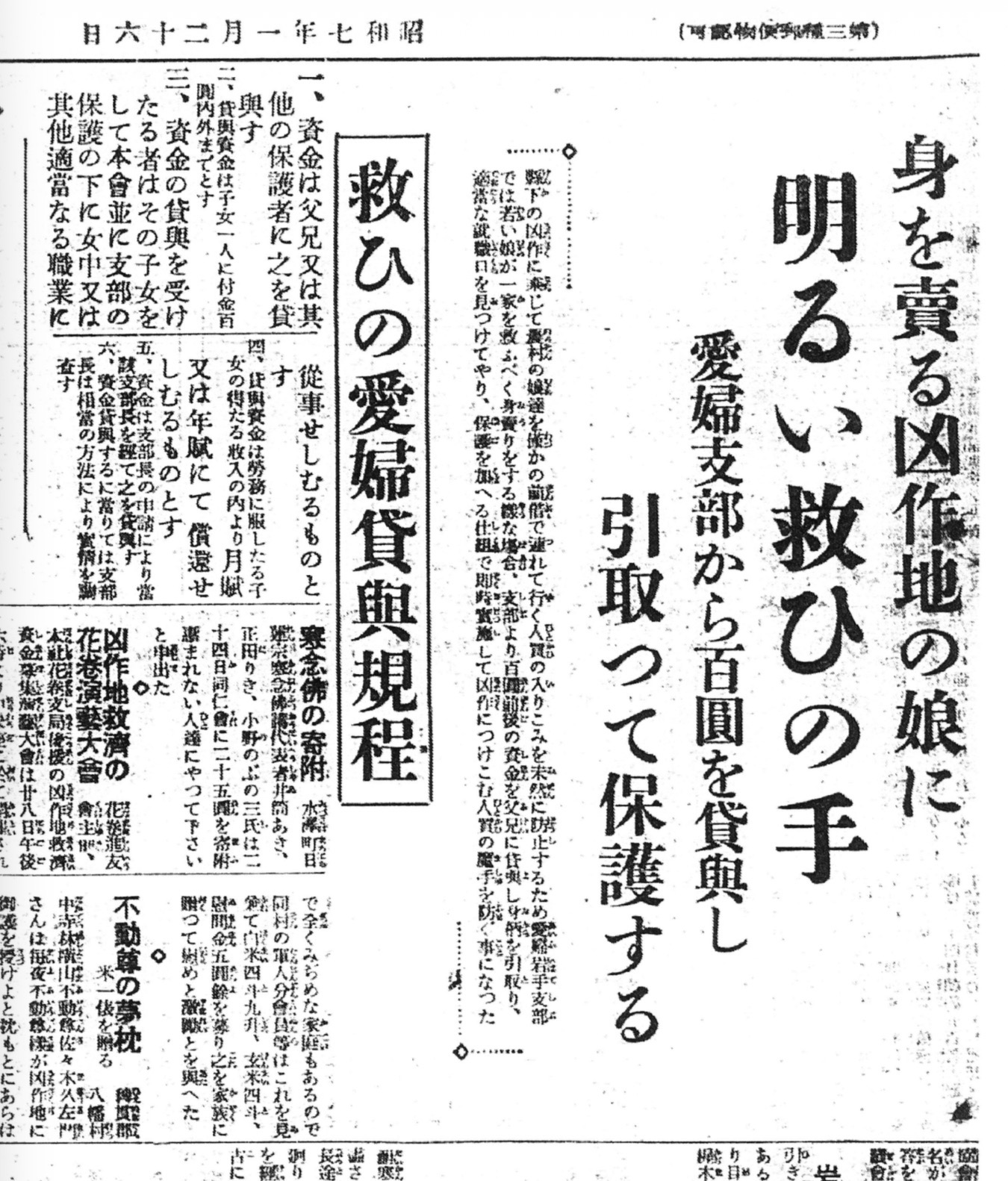 凶作地で身売りをする前に愛国婦人会が100円貸して更正させます(S7.1.25岩手日報)