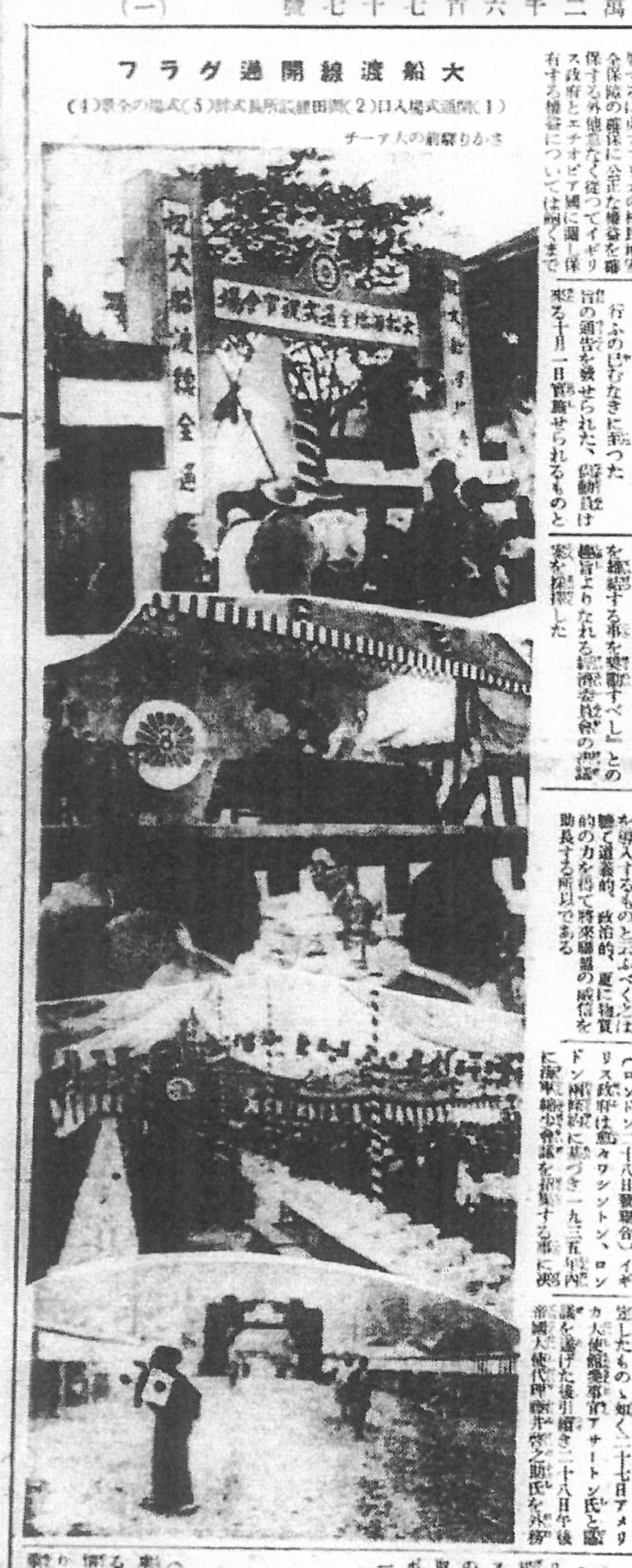 掲載されている写真(グラフィック面)には、装飾された奉祝門や、多くの日の丸が振られる様子が写し出されています。当時の「フラグ(旗)掲出」や「渡船(渡線)開始」といった文字からも、地域を挙げたお祭り騒ぎだったことが伺えます。