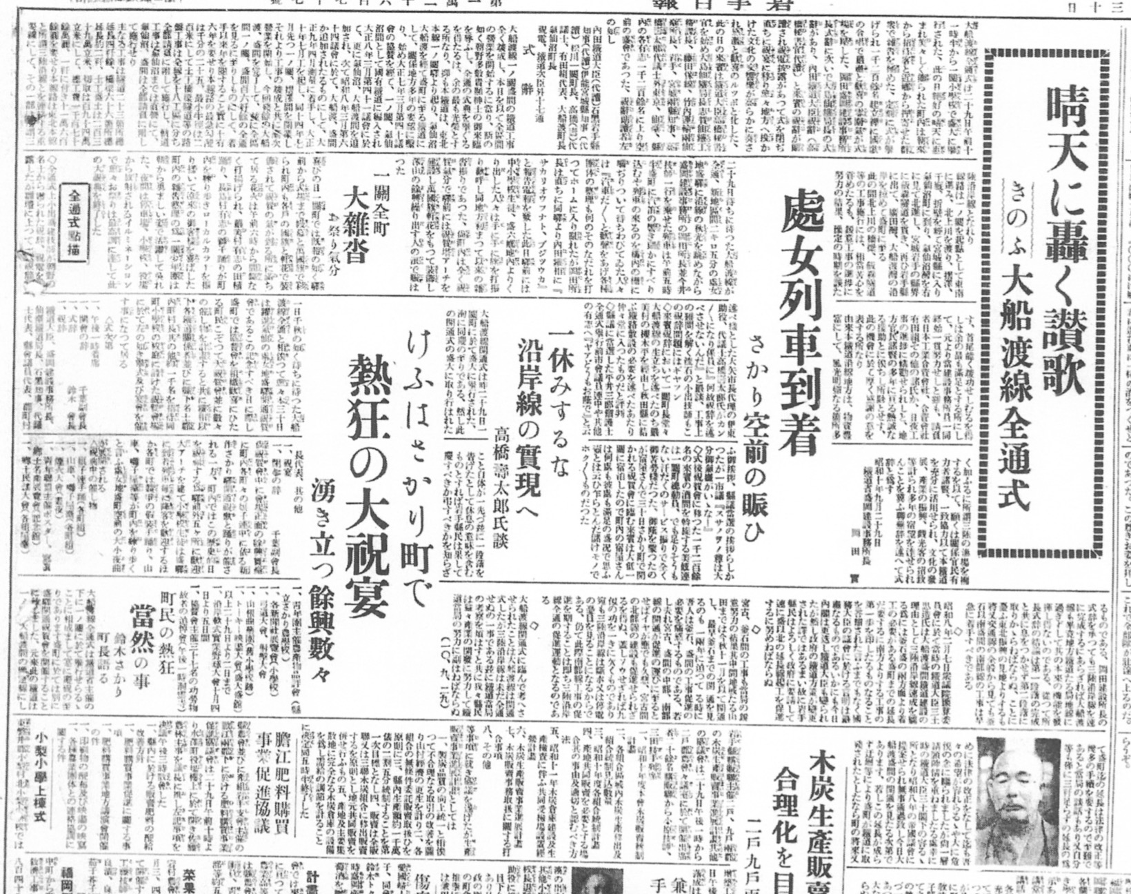 紙面の大きな見出しには、「晴天に轟く讃歌 きのふ大船渡線全通式」の文字。記事によると、当日は雲ひとつない秋晴れの中、盛町を中心に盛大な式典が挙行されたようです。