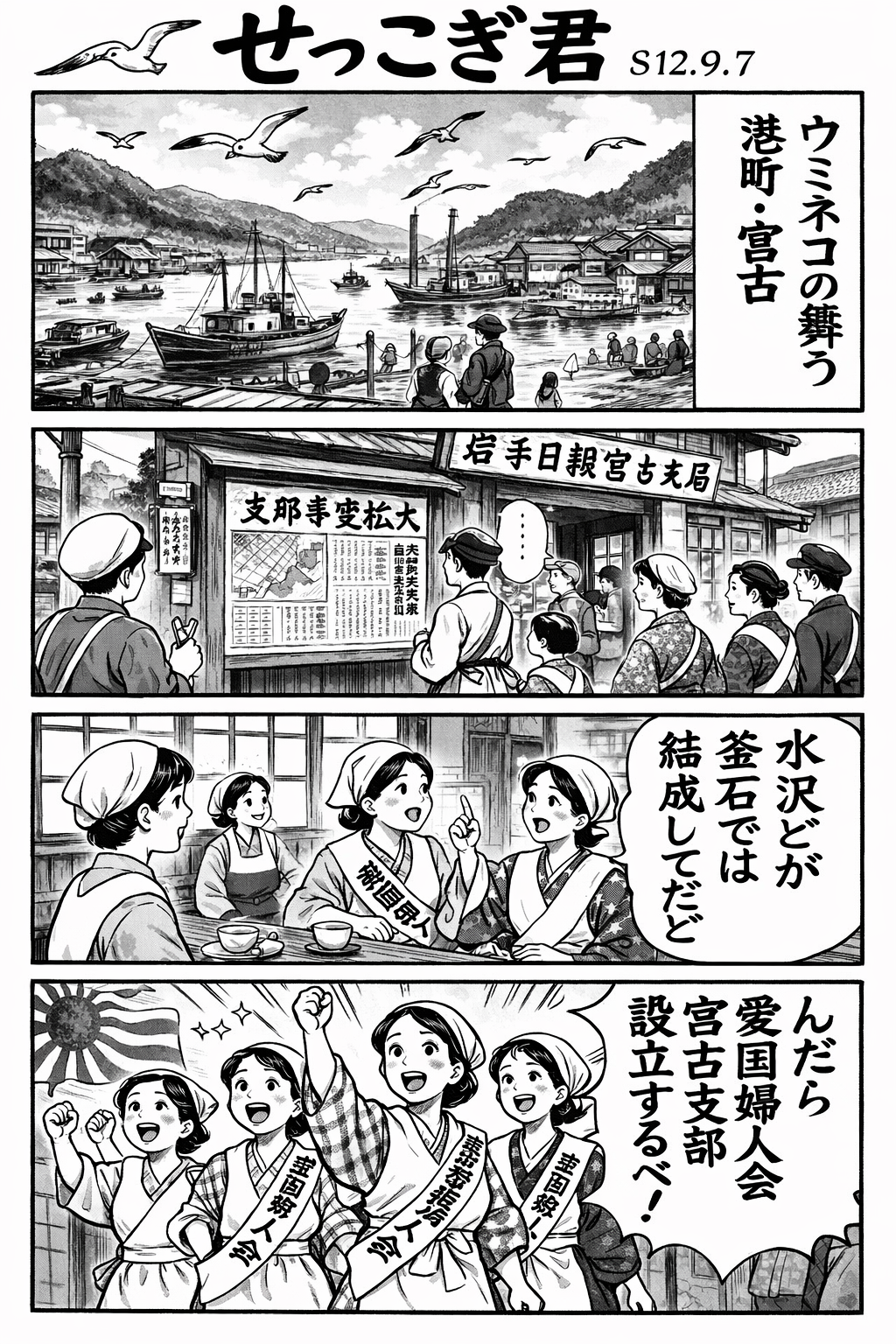 9月1日に水沢支部、9月5日に釜石支部結成。愛国婦人会は銃後の同調圧力を担った悪名高い団体だが、割烹着と襷さえ着ればみんな平等という意味では、フェミニスト的には一定の評価があるのだという。