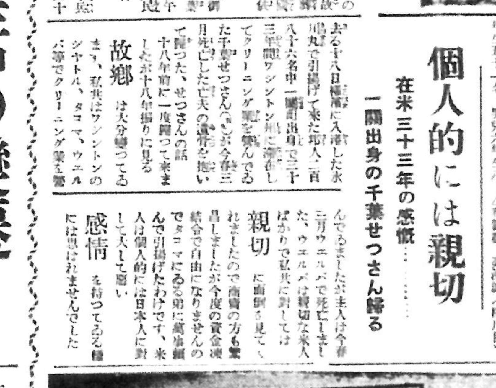 記事の中で彼女は、国家間の対立や資金凍結といった厳しい現実を背景にしながらも、現地の米国人個人については親切であったと述べています。これは社会全体に渦巻いていた激しい排日ムードや経済的な圧迫と、長年築いてきた隣人との人間関係との間で揺れ動く、当時の在米邦人の複雑な心境を物語っています。