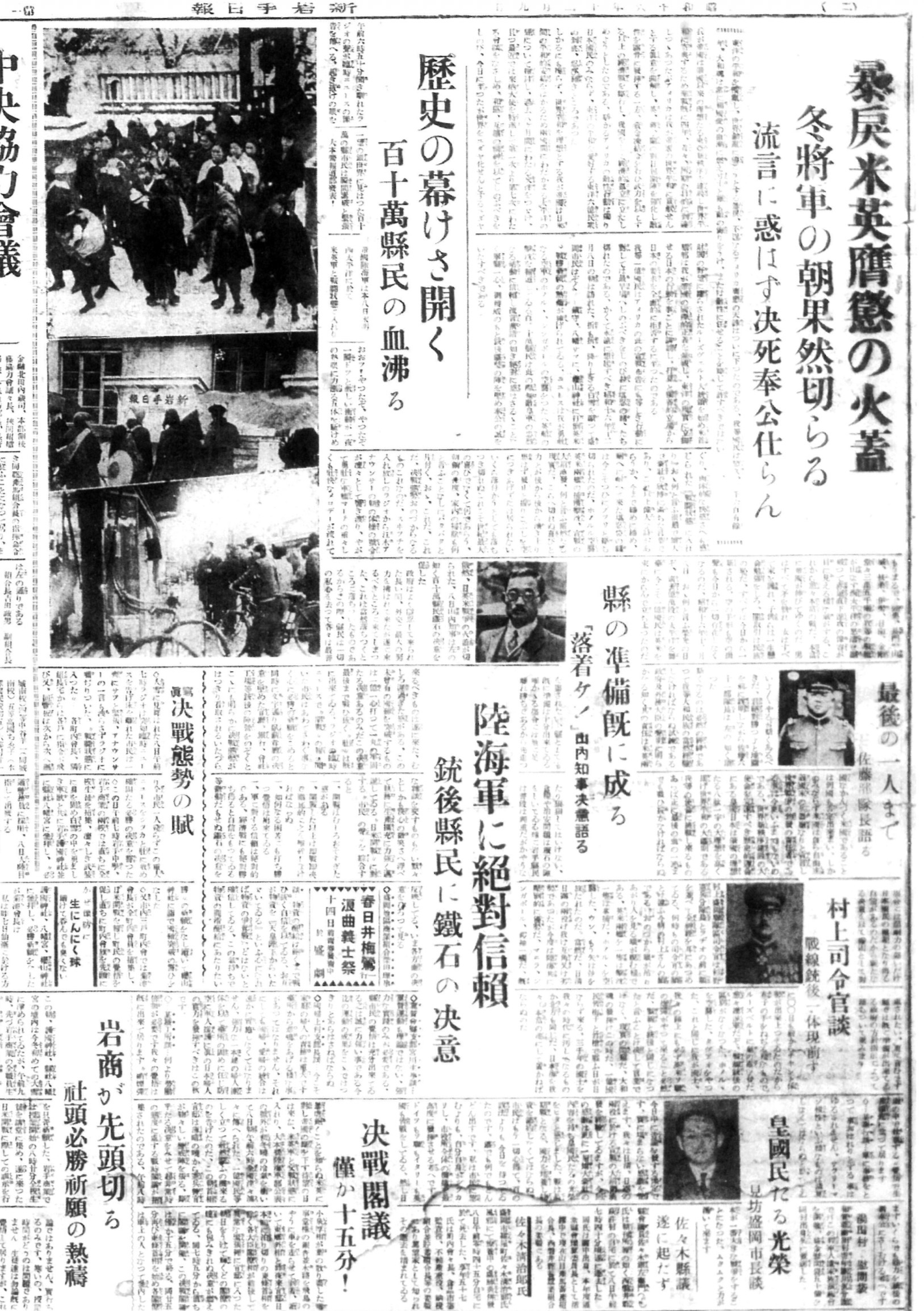 紙面右側には当時の山内知事や村上司令官の談話が掲載され、県民に対し「落ち着いて事に当たれ」と説きつつも、軍への絶対的信頼と協力が強調されています。