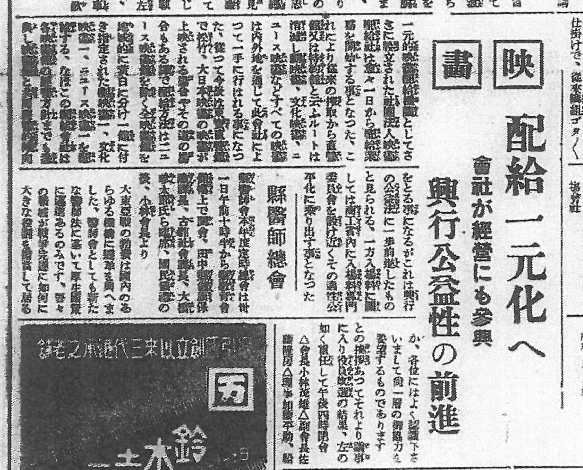 記事の見出しには「配給一元化へ」「興行公益性の前進」と力強く躍っています。