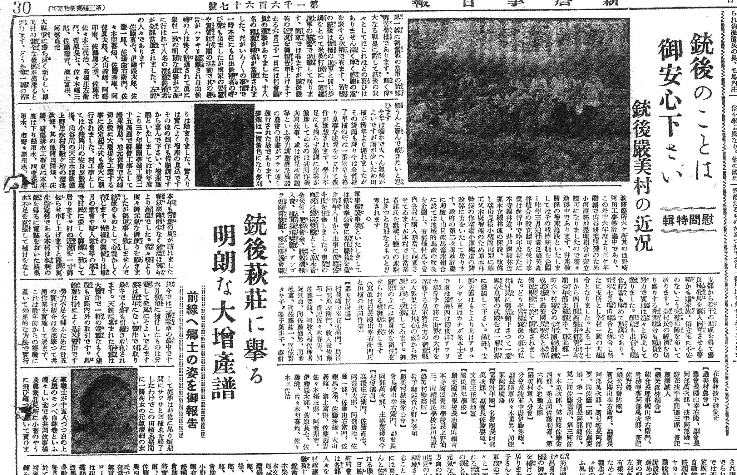 昭和17年7月5日の新岩手日報には、当時の西磐井郡厳美村(現在の一関市)の「銃後」の様子が記されている。記事の冒頭には「第一線に御奮戦の皇軍の皆様ご苦労様です」という文言が置かれ、戦地への敬意を示す決まり文句として当時の新聞にしばしば見られた表現である。