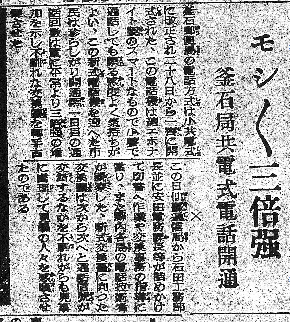 昭和18年4月1日付の新岩手日報によれば、岩手県内で2番目に市制を施行し重工業都市として発展を続けていた釜石市において、通信網の劇的な刷新が行われました。