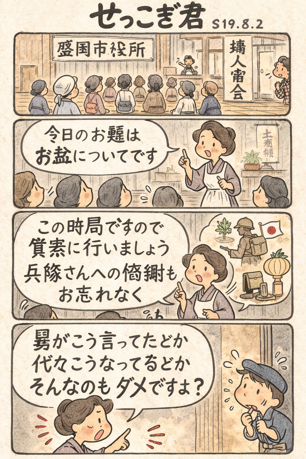 盛岡市婦人常会で「お盆は決戦型で極めて質素に!戦地への感謝も忘れずに!」と決議され、なおかつ「舅がこう言ってたとか、ウチでは代々こうしてるとかもナシですよ!」と決まったらしい。