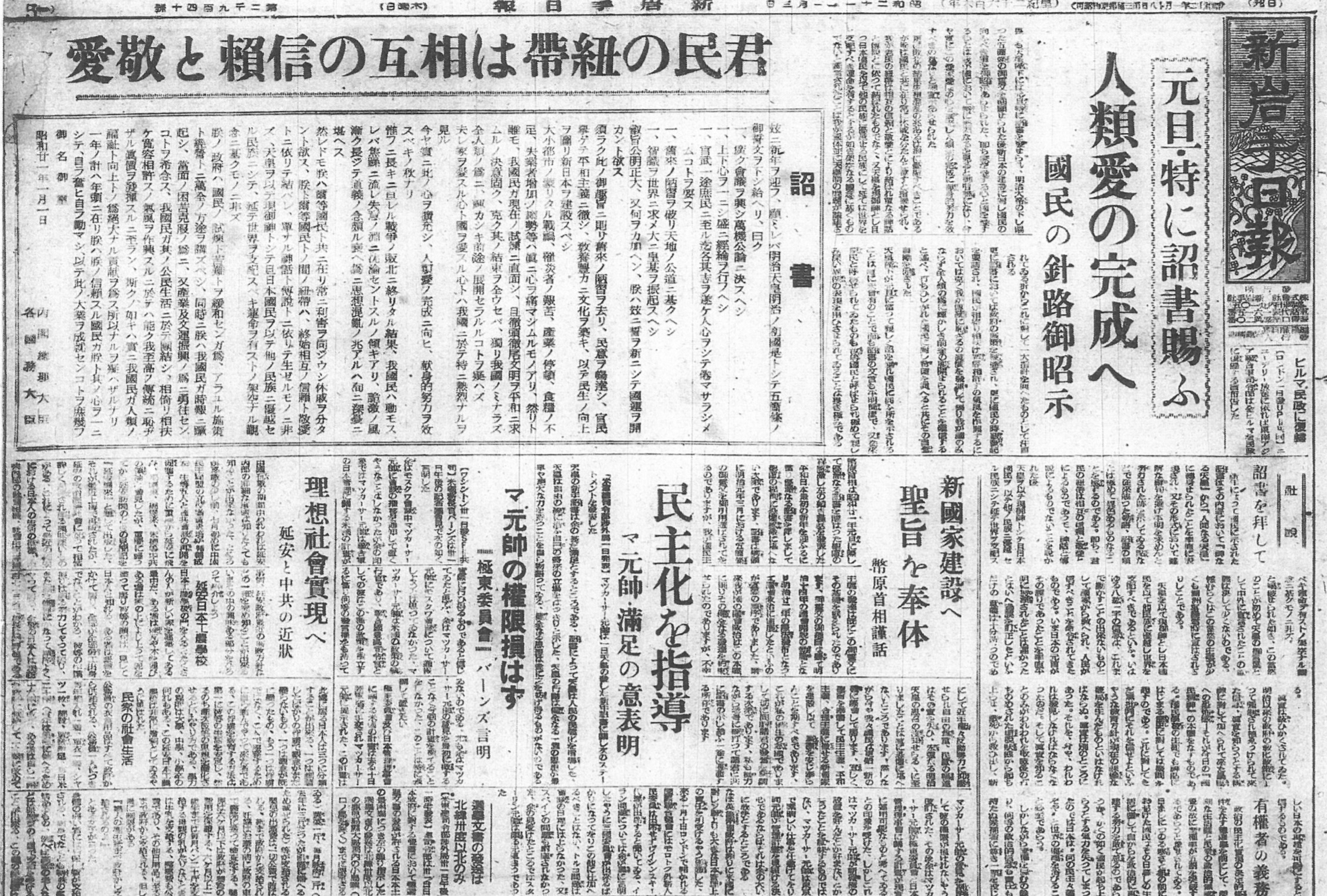 この日の紙面を飾っているのは、昭和天皇がいわゆる「人間宣言」を行われた際の詔書(しょうしょ)に関するニュース。終戦からわずか数ヶ月、激動の時代の空気がそのまま閉じ込められたような一面をご紹介します。