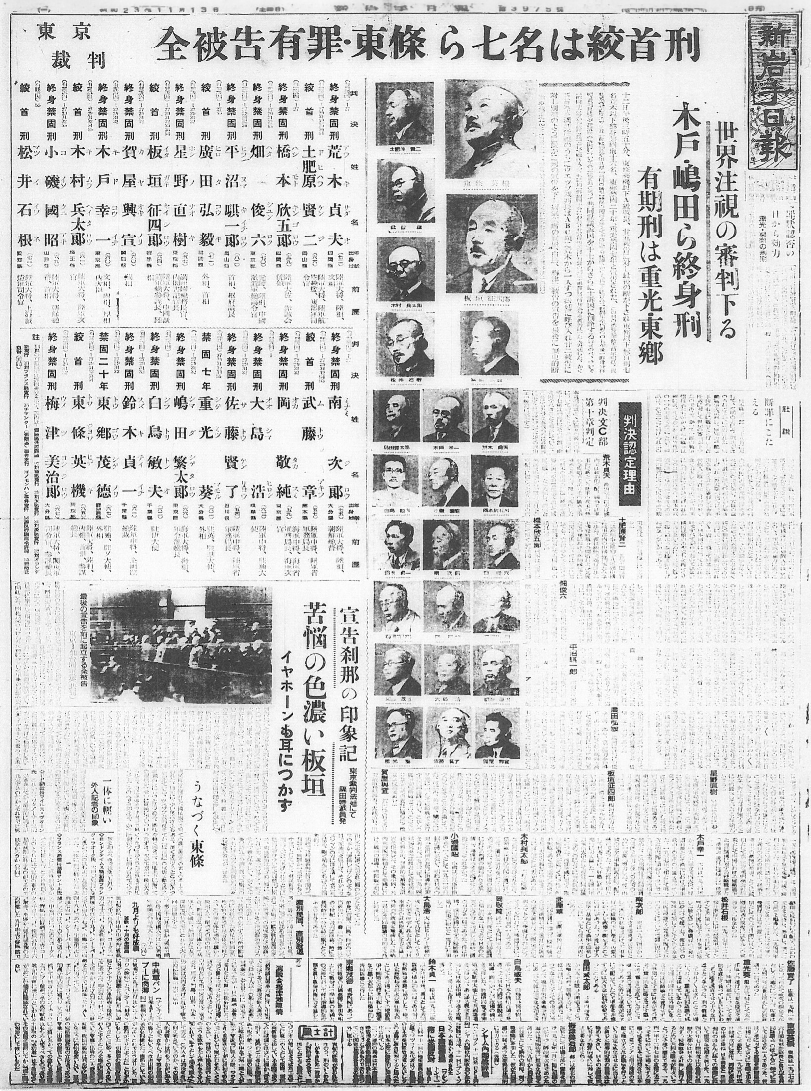 東京裁判で東條英機・板垣征四郎らに絞首刑の判決(S23.11.12新岩手日報)