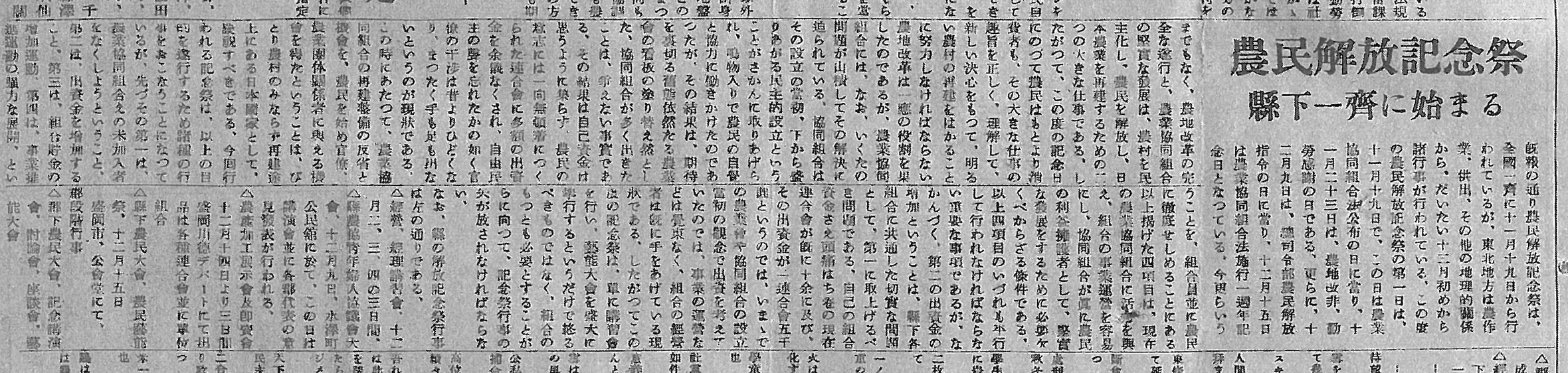 東北地方は農作物の供出などの農繁期と重なっていたため、岩手県下での記念祭は12月初めから一斉に始まりました。岩手夕刊の紙面からは、単なるお祭り騒ぎに留まらない、農業協同組合を健全に運営し自立していこうとする農民たちの強い意志が読み取れます。