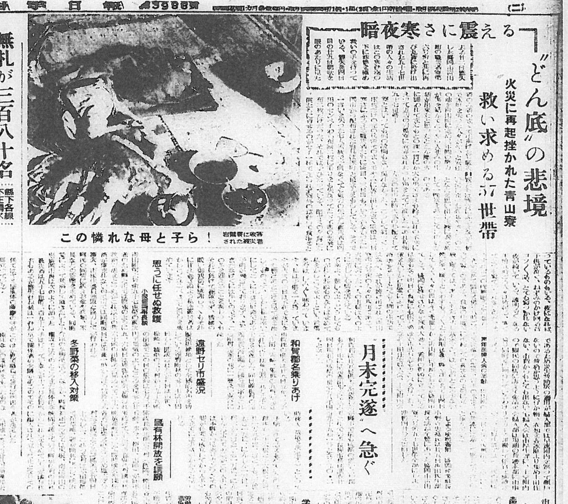 青山寮の火災で焼け出された人々(S23.11.25新岩手日報)
