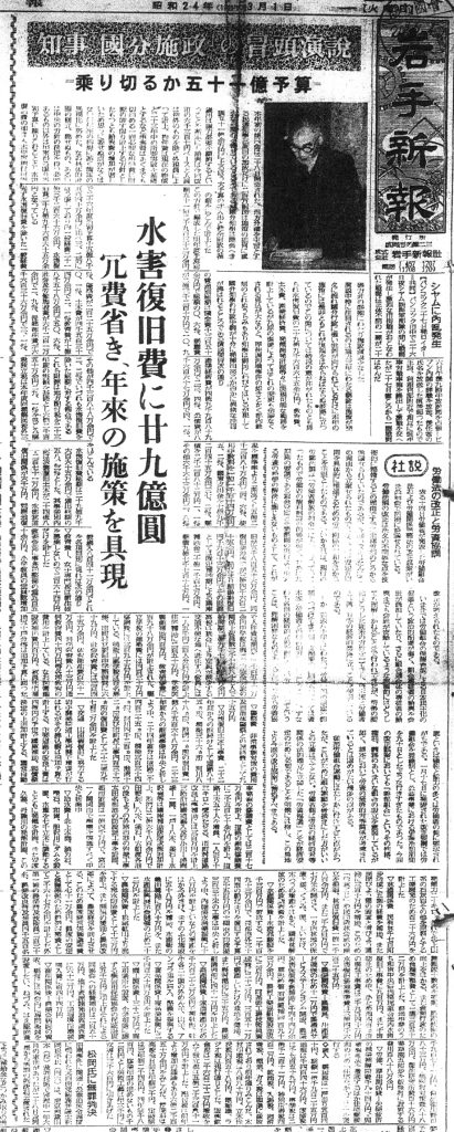 今から70年以上前、昭和24年(1949年)3月1日付の『岩手新報』。そこには、相次ぐ大規模水害に見舞われた岩手県を立て直そうとする、当時の国分謙吉知事による決死の施政方針が刻まれていました。