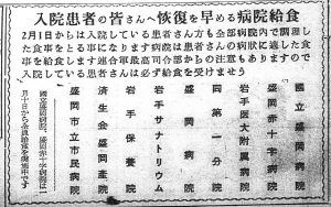 昭和25年1月14日の岩手新報に掲載されたこの公告は、現代の私たちにとっては当たり前の存在である病院給食が、実はGHQ主導による医療改革の大きな転換点であったことを物語っています。
