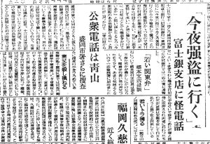 紙面の中心を飾るのは、盛岡市紺屋町にある富士銀行盛岡支店に掛かってきた1本の怪電話です。前日の午前11時頃、若い関東弁の男から今夜6時30分頃に強盗に行くから十分警戒して準備しておけという、あまりに大胆不敵な予告が届きました。