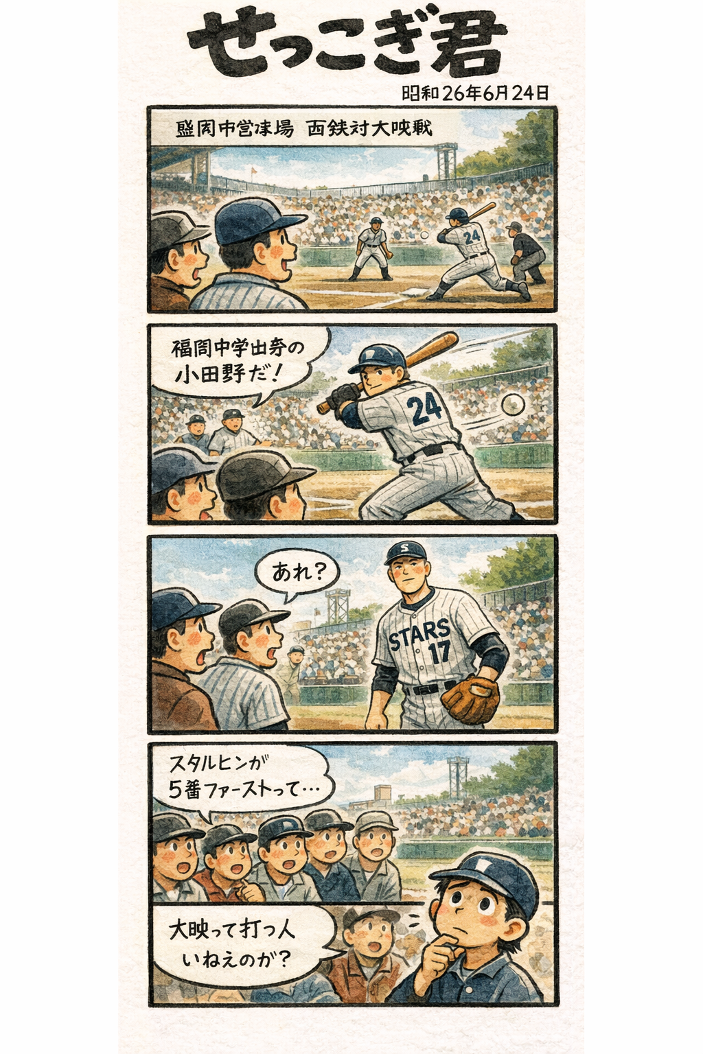 11−3で西鉄が大勝したが福岡中学出身の小田野柏も1打点。対する大映はスタルヒンが5番ファーストに入っていた。