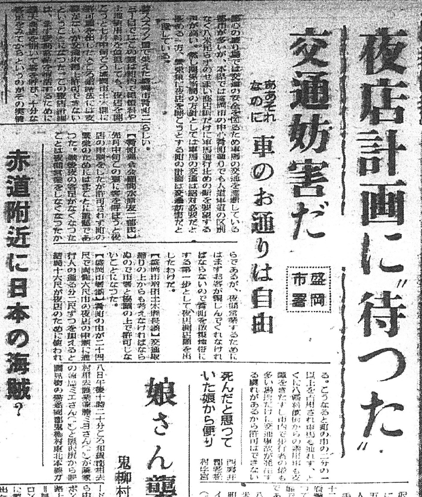 昭和二十六年八月六日付の「夕刊いわて」には、当時の盛岡市肴町商店街が直面していた“夜店問題”が大きく取り上げられている。
