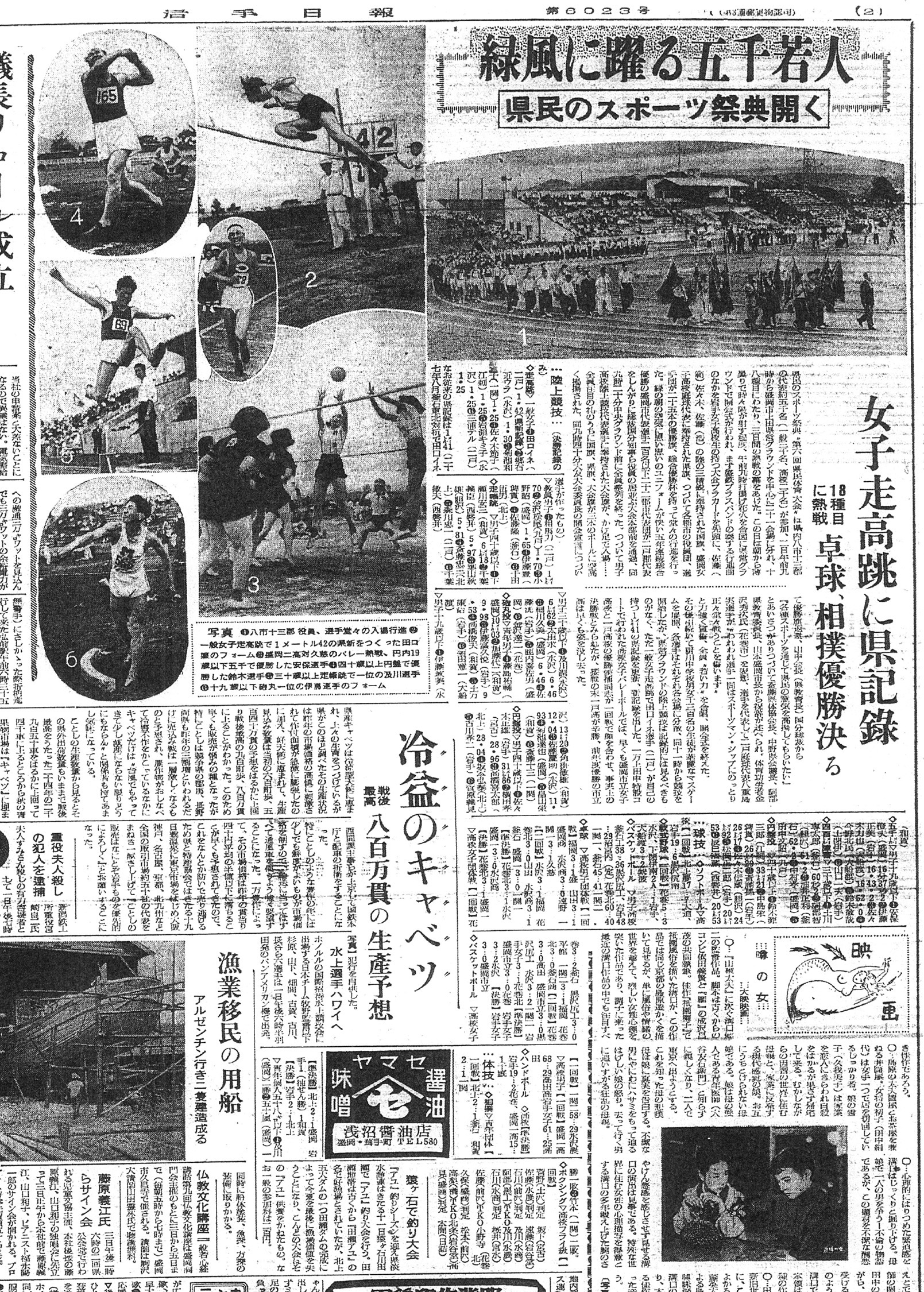 この日の新聞は、スポーツの祭典という華やかな話題を軸にしながらも、冷害という自然の厳しさ、そして海を渡る移民の決意といった、昭和20年代末期の岩手が抱えていた光と影、そして明日への希望を克明に映し出しています。