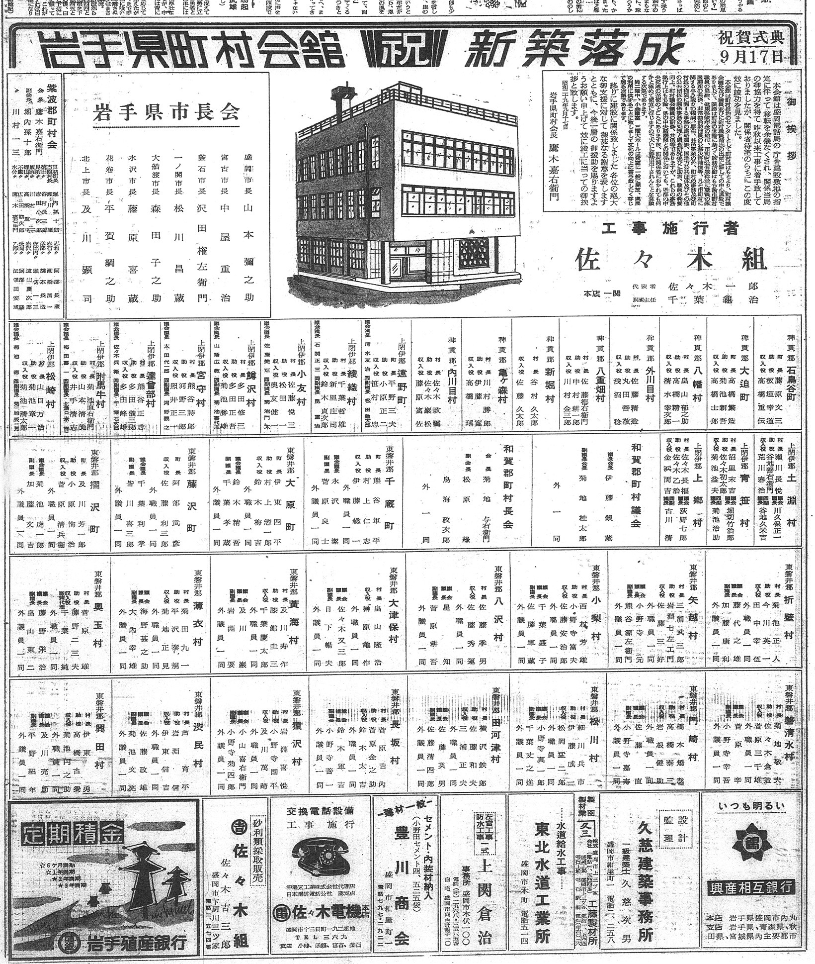 一枚の広告から浮かび上がるのは、戦後復興期から高度成長期へと向かう途中で、地方自治の器もまた更新されていったという事実だ。町村会館の新築落成は、単なる建物の完成ではなく、岩手の自治が次の段階に進んだことを象徴する出来事だったのだろう。