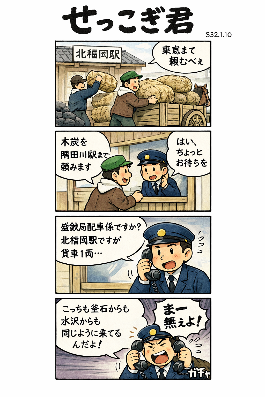 貨車不足で北福岡駅から木炭が出荷できず(昭和32年1月10日)