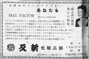 昭和36年1月14日の岩手東海新聞に掲載された、釜石の及新デパートによるマックスファクターの広告から、当時の華やかな空気感を振り返ってみたいと思います。