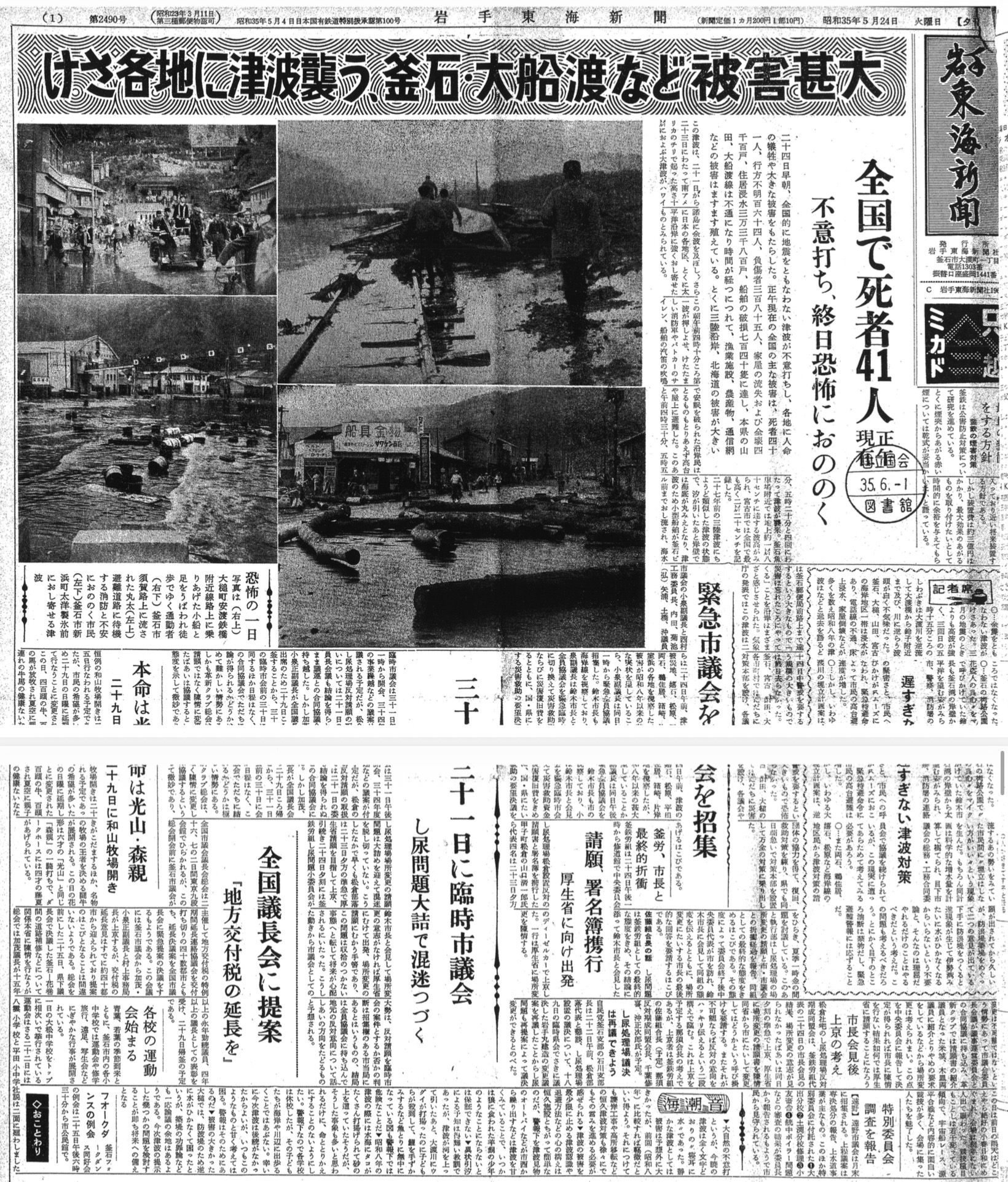 昭和35年5月24日に発生したチリ地震津波は日本国内での地震の揺れを伴わなかったため多くの人々にとって寝耳に水の出来事でした。ご提示いただいた岩手東海新聞の紙面は、まさにその混乱の渦中に発行されたものであり、不意打ちという言葉が当時の切迫した状況を雄弁に物語っています。