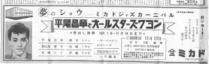 ここで重要なのは、平尾昌章が「後年の大作曲家・平尾昌晃」としての顔よりも、昭和36年当時はむしろ“興行の第一線にいる人気者”として地方を回っていた、という点だ。ロカビリー・ブームの中心にいた世代で、ヒット曲も持ち、紅白にも出る。そういうスターが「平尾昌章とオールスターズ・ワゴン」の名義で、映画館のステージに乗り込んでくる。映画を観るための場所だった錦館が、その日は「本物のスターが来る会場」になるわけで、これは街にとって十分に事件だったはずだ。
