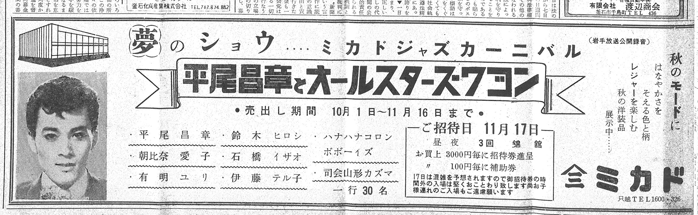 釜石の衣料品デパート「ミカド」が告知しているのは、11月17日に錦館で開催される「平尾昌章とオールスターズ・ワゴン」ショーの招待券だ。発行条件ははっきりしていて、ミカドで3,000円買うごとに招待券を出す――つまり、服を買う理由を“ステージの熱”で後押しする、当時らしい販促である。