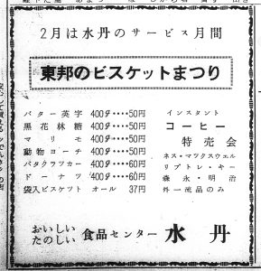 昭和37年1月26日付の岩手民声新聞を開くと、当時の江刺市にあった食品センター「水丹」の活気ある広告が目に飛び込んできます。2月をサービス月間と銘打ったその紙面で、何より目を引くのは「東邦のビスケットまつり」という大きな見出しです。