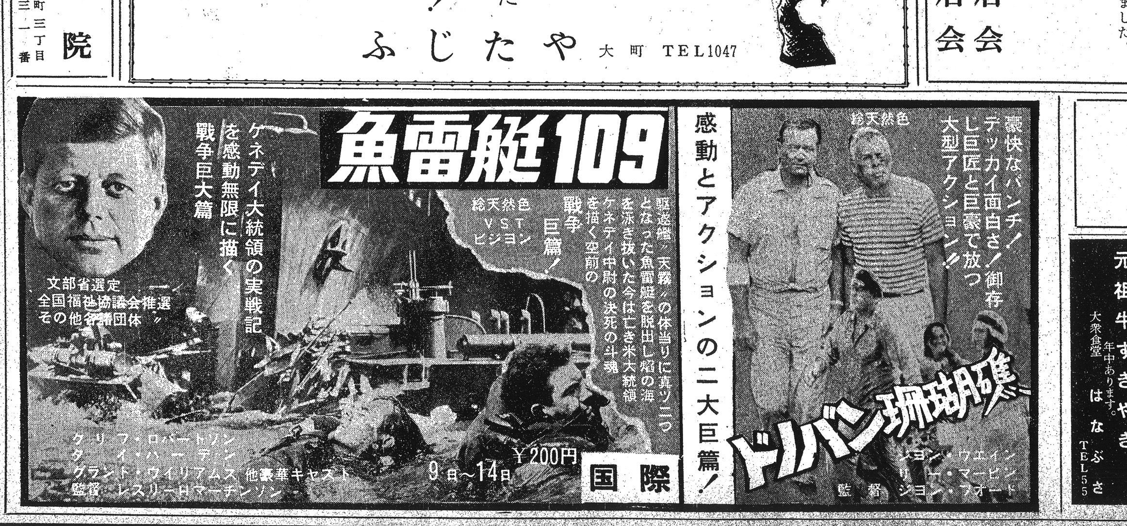 広告の左側を大きく飾るのは、ジョン・F・ケネディ大統領の若き日の実戦記を描いた「魚雷艇109」です。前年の11月に暗殺という悲劇に見舞われたばかりのケネディ大統領をしのぶように、文部省選定や全国福祉協議会推奨といった文字が並び、社会的な関心の高さがうかがえます。駆逐艦天霧の体当たりによって真っ二つになった魚雷艇を脱出し、ケネディ中尉が部下を連れて泳ぎ抜いたという決死の闘魂は、当時の釜石の人々の目にも勇ましく映ったことでしょう。入場料200円という数字も、当時の物価を知る上で非常に興味深い資料です。
