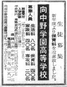 広告の紙面で最も目を引くのは、新年より保育科を新設したという力強い告知です。当時は共働き世帯の増加に伴い、専門知識を持った保育者の育成が急務となっていた時代でした。募集学科には生活科、保育科、家政科、そして専攻科が並んでおり、衣食住や児童教育といった、生活に密着した学びを大切にしていた学校の姿勢が伝わってきます。