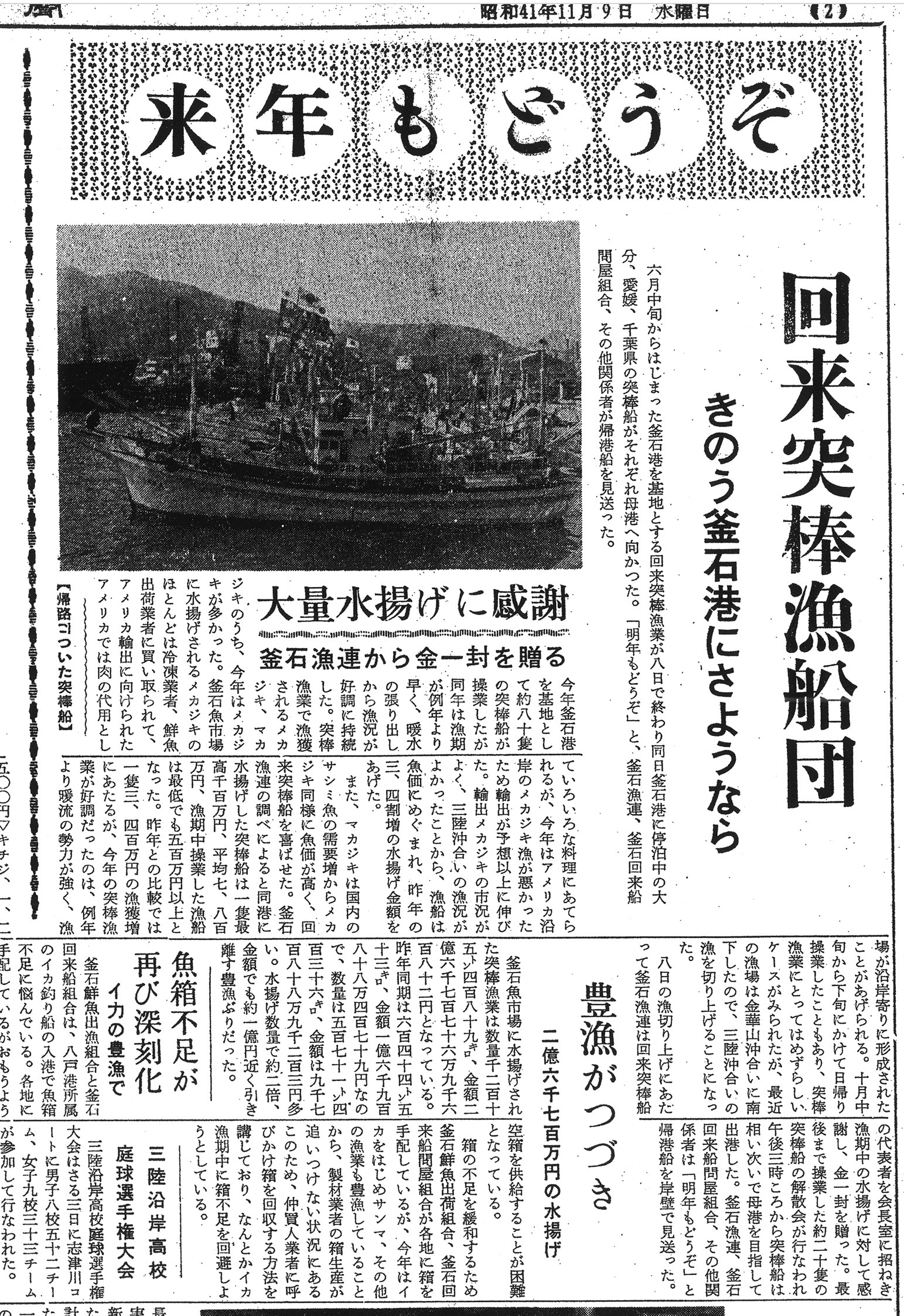 昭和41年11月9日の岩手東海新聞には、釜石港のにぎわいを象徴するような記事が載っていました。6月以降、釜石港を拠点に操業してきた千葉・愛媛・大分各地の「回来突棒船団」がシーズンを終えて撤収し、釜石漁協がその働きをねぎらって金一封を贈ったという内容です。