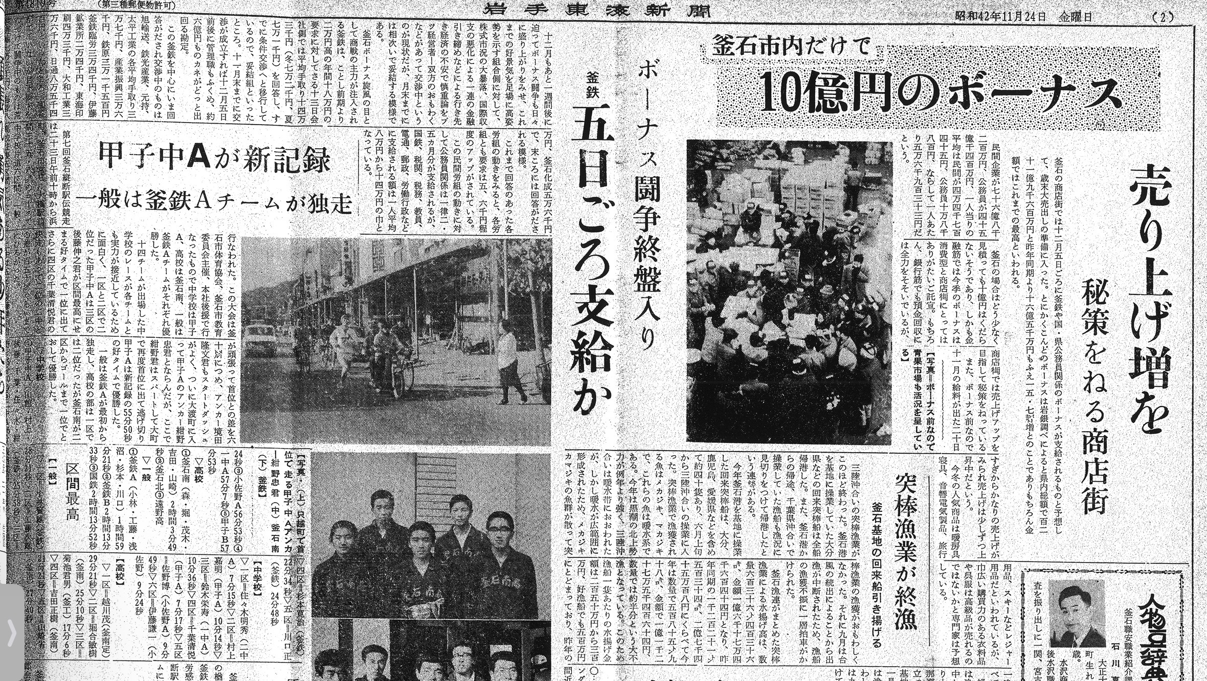 製鉄所の景気が街に直結していた頃の釜石。ボーナスの行方を見守りながら、商店街が活気づいていく様子は、まさに高度経済成長期の地方都市の象徴のようでもある。昭和の街に漂う、あの“年末ならではの空気”が紙面からよみがえるようだ。